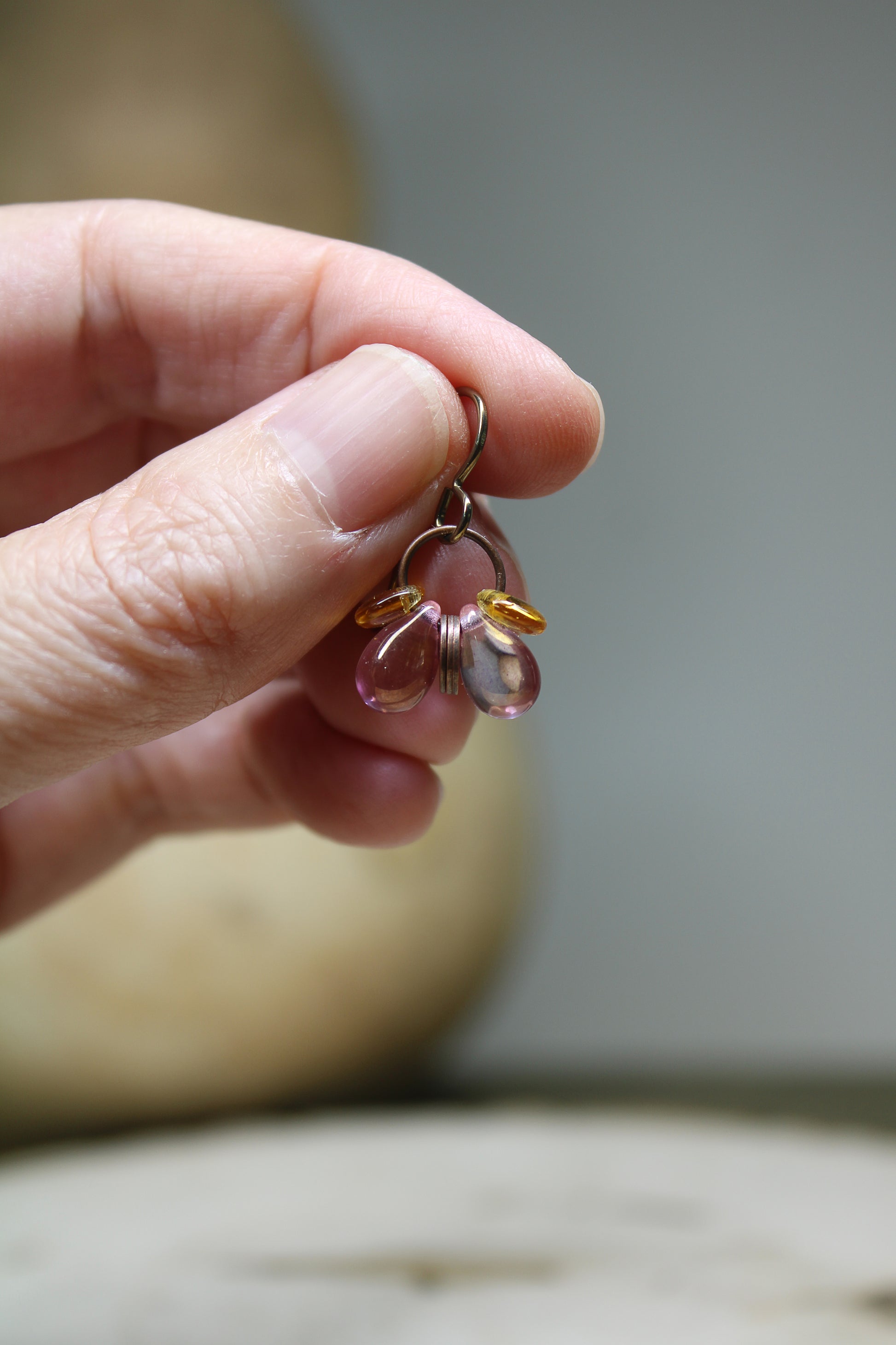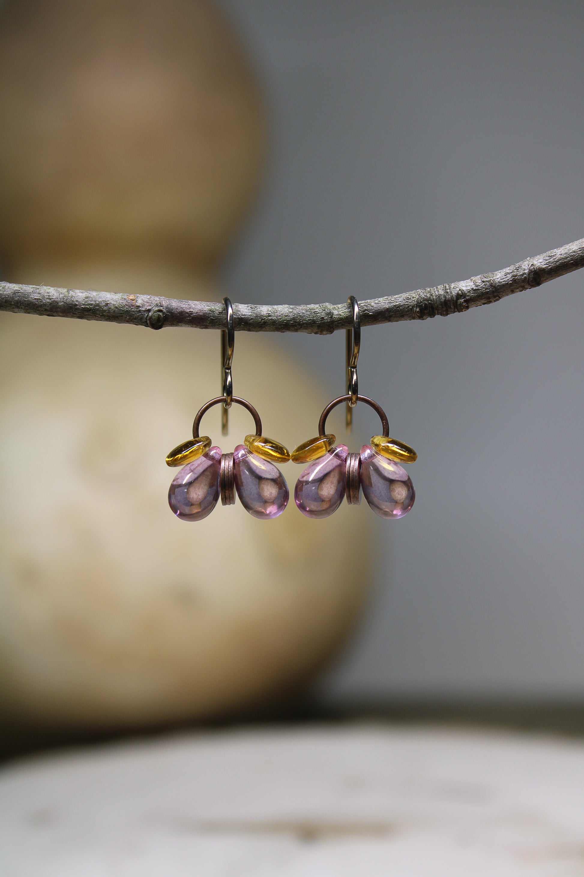 Here is a pair of abstract Czech glass and copper butterflies. I selected Czech glass pink and amber color glass beads to represent the wings, and a copper element to exemplify the butterfly's abdomen.