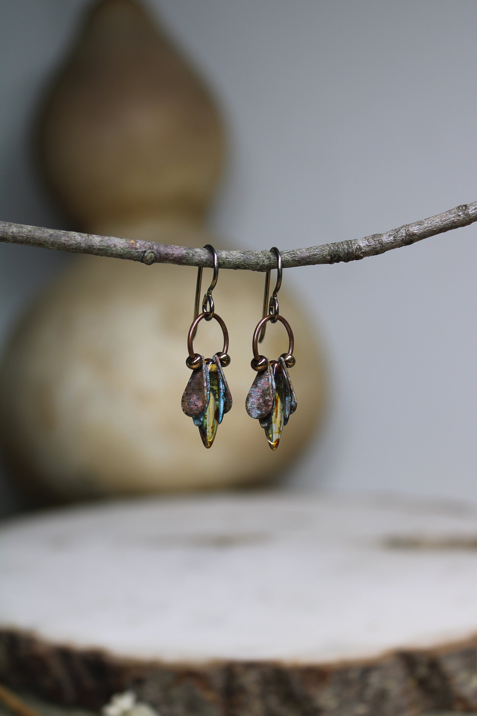Here is a pair of dainty firefly earrings featuring an amber-colored Czech bead and tiny bronze glass eyes. I chose to represent the firefly wings with hand-painted patina on brass elements.